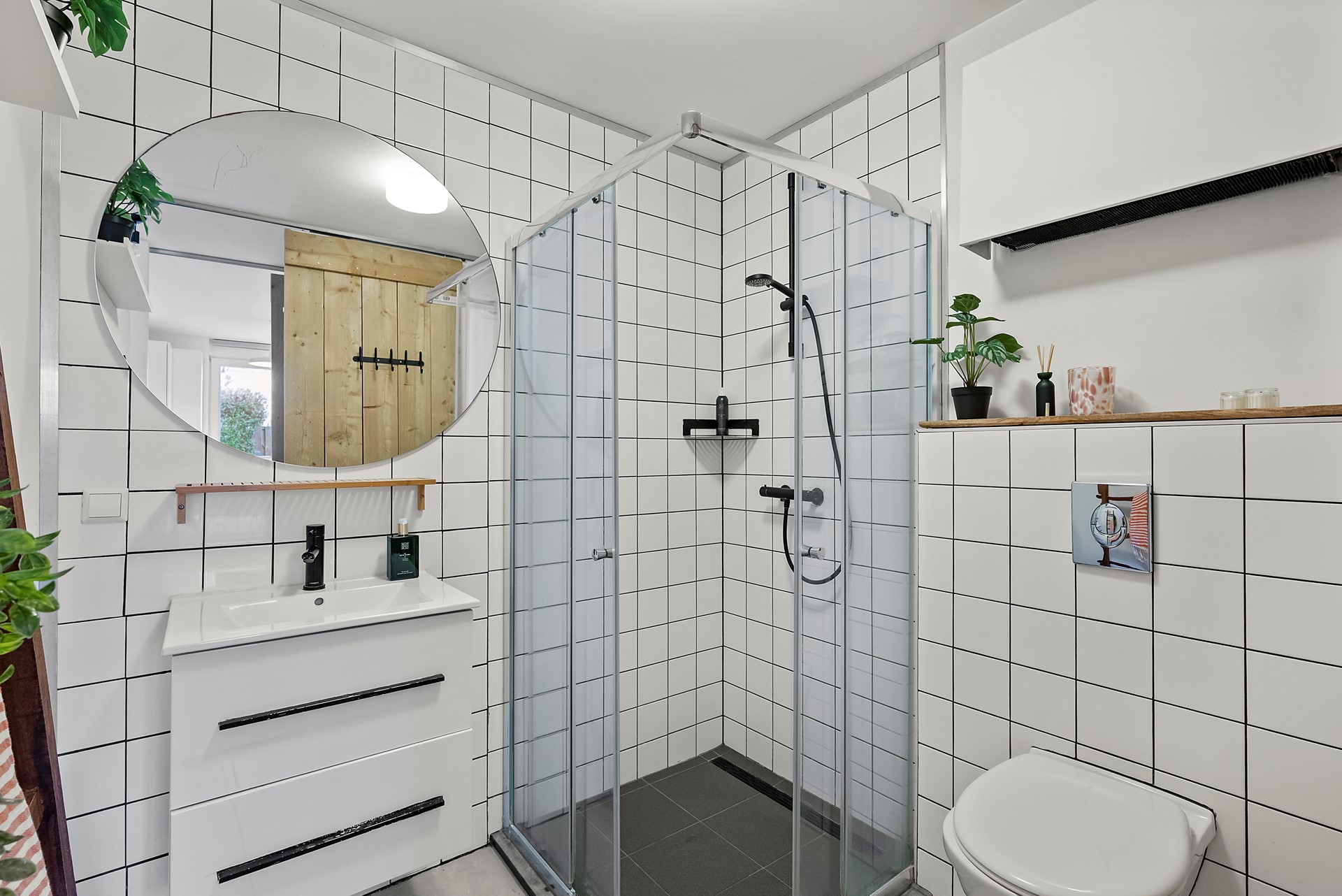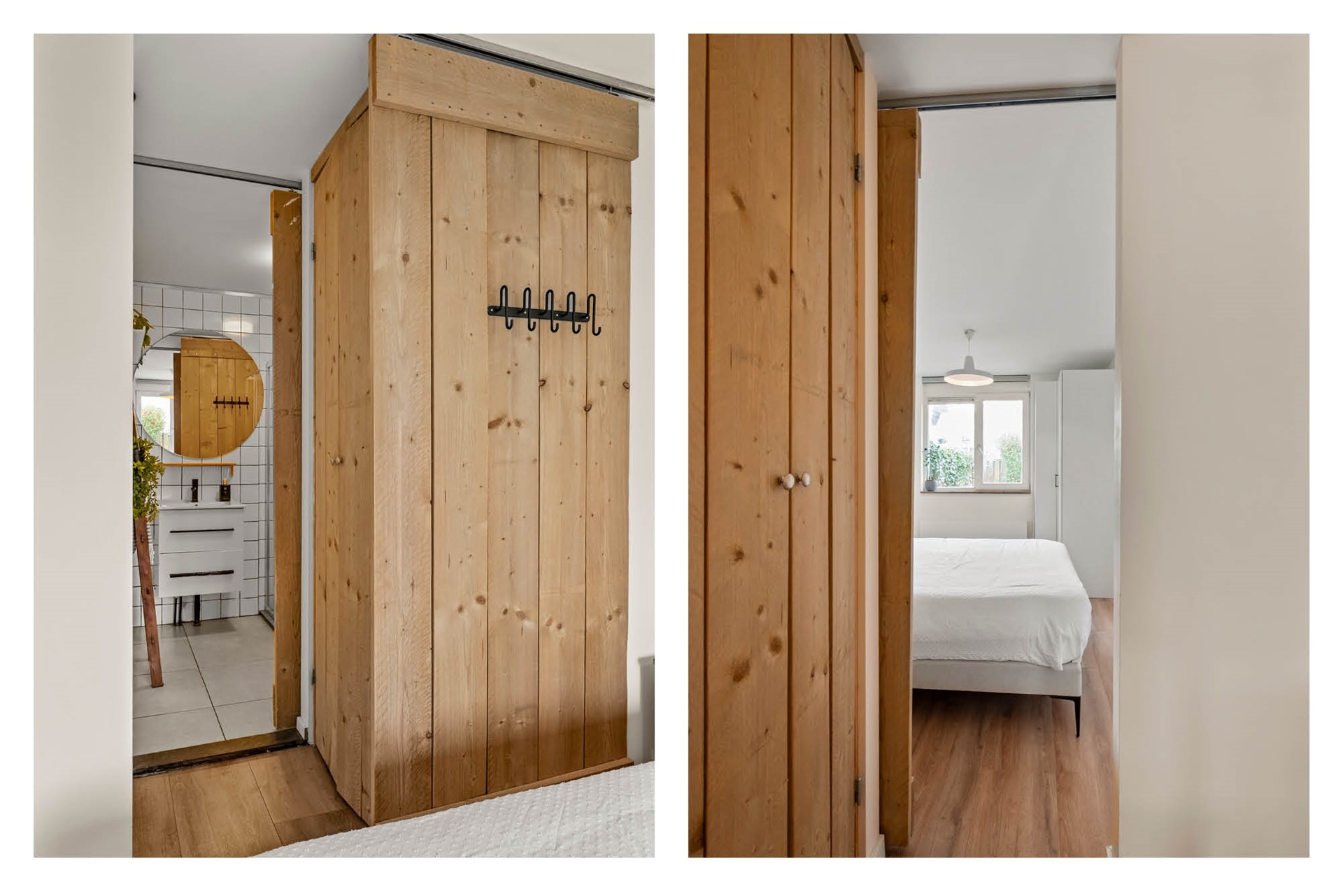 De slaapkamer is ruim genoeg voor een tweepersoonsbed en een grote kledingkast. Ook de nette badkamer is voorzien van een inloopdouche, wastafel en een toilet. Tussen de slaapkamer en de badkamer bevindt zich een praktische bergkast voor de wasmachine en de droger. Tevens is daar de cv-ketel opgehangen.