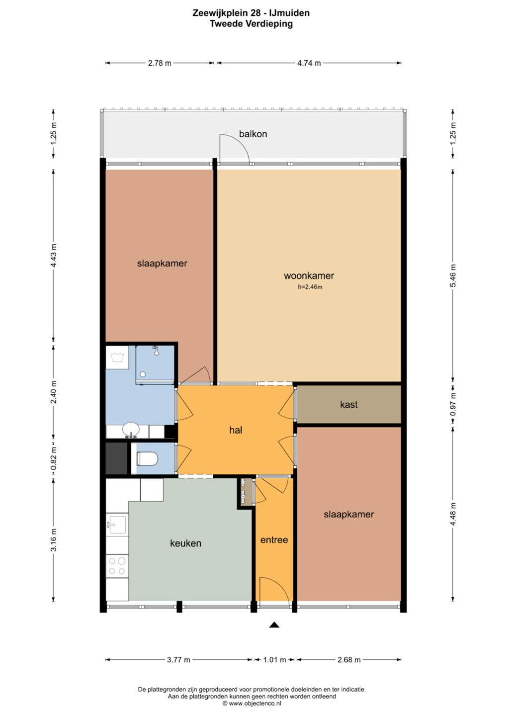 Entree via de grote hal op de begane grond. Zeewijkplein 28 is gelegen op de tweede verdieping. Binnenkomst in de gang met meterkast. Dan kom je in de tussenhal van het appartement, met deuren naar de verschillende vertrekken, waaronder de keuken, die in 2023 helemaal vernieuwd is en voorzien is van allerlei inbouwapparatuur, zoals een koelvriescombinatie, een inductie kookplaat, een afzuigkap met koolstoffilter, een deur naar het toilet, de badkamer, de slaapkamer, de woonkamer met toegang naar het balkon, een bergruimte en een deur naar de tweede slaapkamer, cq hobbykamer.